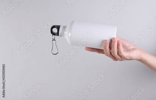 White metal water flask, thermos bottle in hand on gray background. Mockup for design