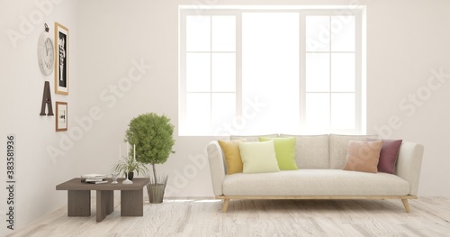White minimalist living room with sofa. Scandinavian interior design. 3D illustration