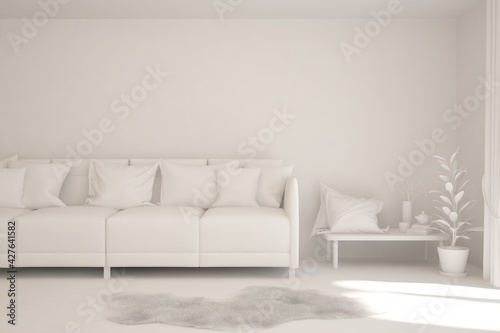 White minimalist living room with sofa. Scandinavian interior design. 3D illustration