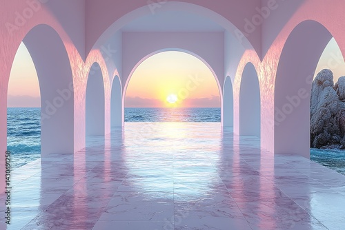 White minimalist style with pink and white color scheme, arched doorways, blue sea, and yellow sun, creating a dreamy beach scene with ethereal and tranquil ambiance.