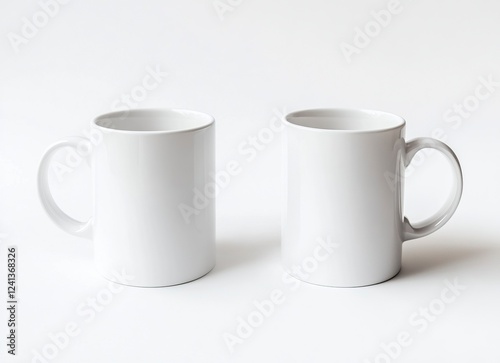 White mug mockup, two mugs side by side on a white background, mock-up for design and print, high-resolution photography, high detail, stock photo, professional color grading, clear, sharp focus.
