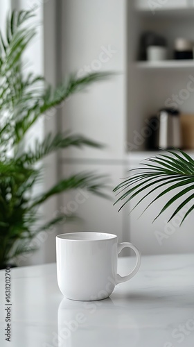 White Mug on Marble Table with Palm Fronds in Minimalist Interior Setting