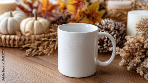 White mug showcases fall decorations with leaves and pumpkins on a dark wood table, enhanced by glowing candles and bokeh lights