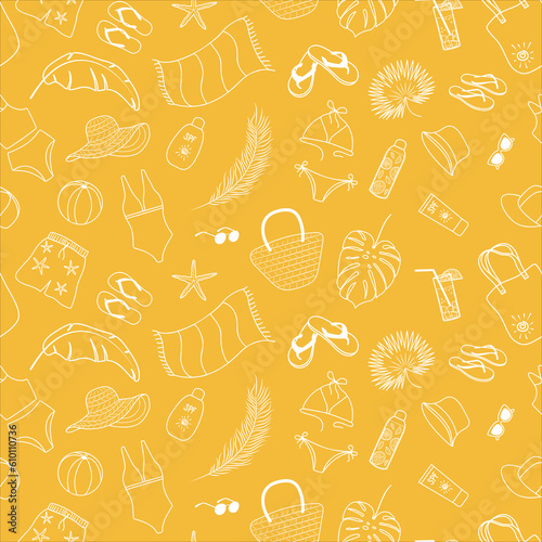 White outline of beach accessories on a yellow background. Seamless summer pattern. Background with beach elements and palm leaves