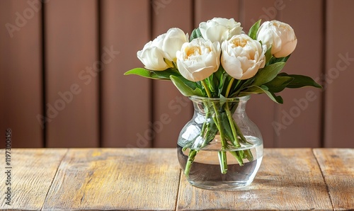 White peonies in glass vase on wooden table against brown backdrop