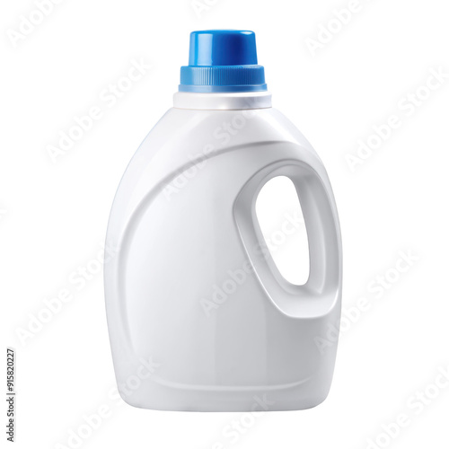 White plastic detergent bottle with a blue cap. The bottle has a built-in handle for easy pouring and a simple, clean design. Isolated on transparent background, png.