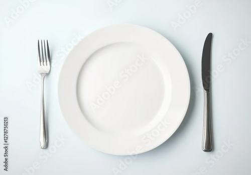 White plate with knife and fork on a white background, top view.