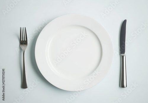 White plate with knife and fork on a white background, top view.