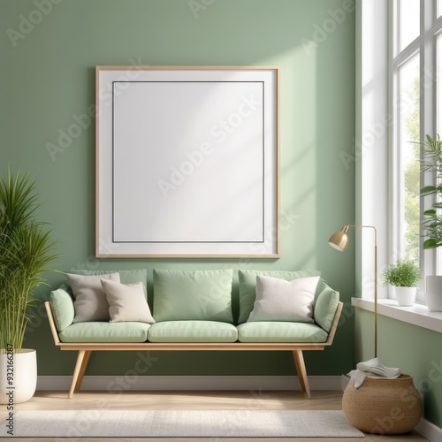 white poster frame close up in modern home interior with light green colored walls, wall mockup, 3d rendering