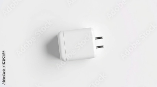 White power adapter on a white background, casting a soft shadow, showcasing simplicity and clean design.