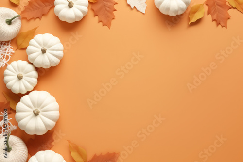 White pumpkins and autumn leaves on orange background. Flat lay, top view, copy space