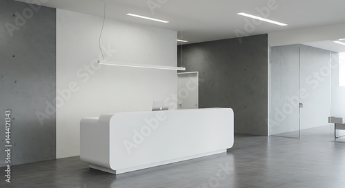 White reception desk with laptop computer on it standing in modern office lobby with gray and white walls and concrete floor.