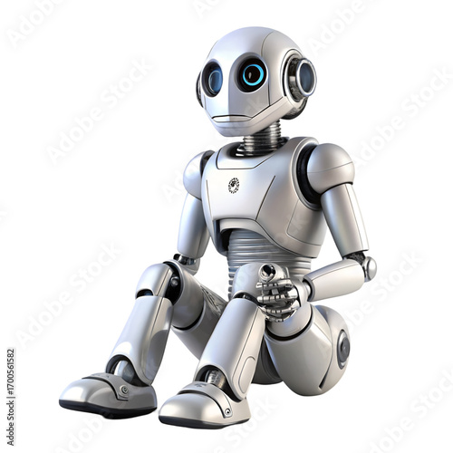 White robot with blue eyes sitting on a white surface isolated on black android artificial intelligence