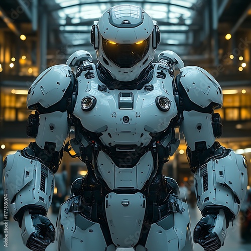 White robotic exoskeleton in industrial setting.