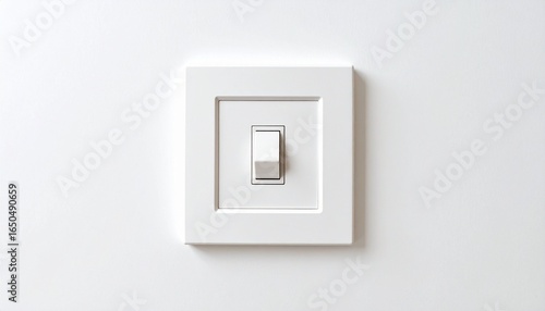 White rocker light switch centered on square faceplate against white wall