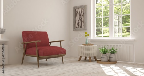 White room with armchair and green landscape in window. Scandinavian interior design. 3D illustration