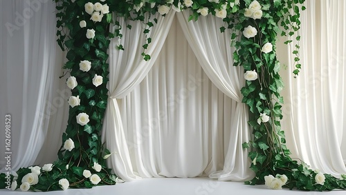 White roses and green ivy draped over flowing ivory curtains creating an elegant archway leaves
