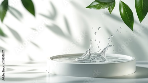 White round podium with a natural water splash and leaf shadows, creating a refreshing display for cosmetic product mockups.