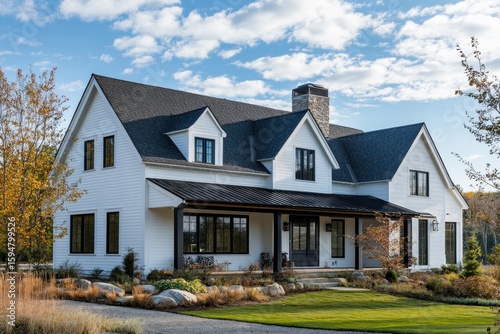 White siding farmhouse, black accents, light rock base, shingled roof under blue sky
