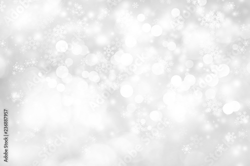 white snow blur abstract background. Bokeh Christmas blurred beautiful shiny Christmas lights. white and gray winter backdrop.