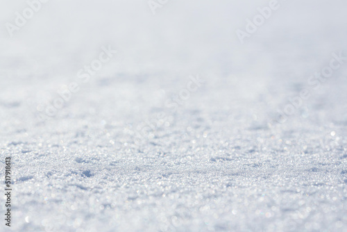 White snow close-up. Winter background with snow texture. Shallow depth of field and blur. Perfect for Christmas and New Year design. View with copy space.