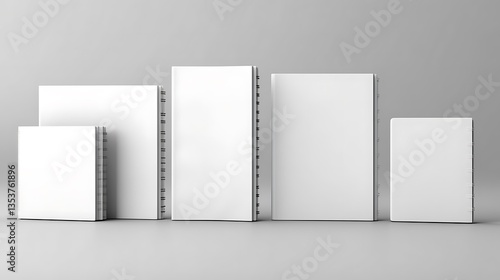 White spiral bound notebooks of varying sizes displayed neatly