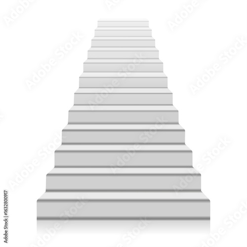 White staircase realistic illustration, isolated on white background. Front view of white staircase. Steps up. A symbol of the Achievements. Blank mockup for platform. Front view of white staircase