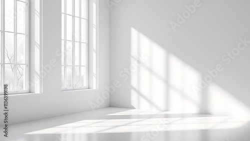 White studio background designed for product presentation, set in an empty gray room with window shadows and a blurred backdrop