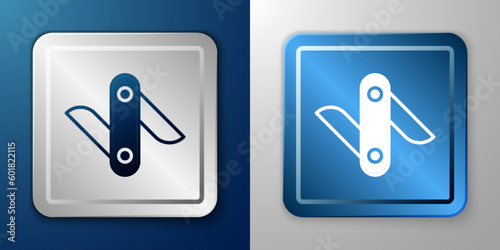 White Swiss army knife icon isolated on blue and grey background. Multi-tool, multipurpose penknife. Multifunctional tool. Silver and blue square button. Vector