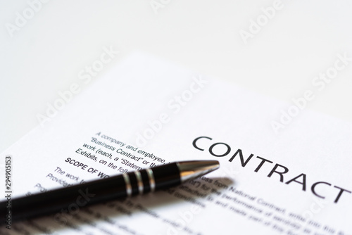 White table with business document contract form paper and empty space to sign authorized signature, copy space available for text