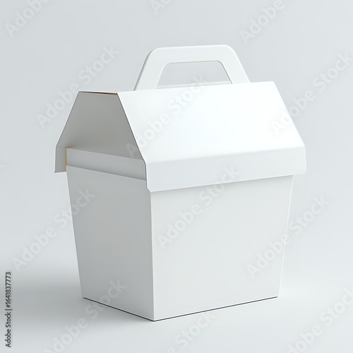 White takeout food box with handle on light background, isolated mockup for branding and packaging design. Clean minimal presentation.