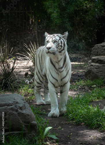 white tiger standing with an elegant posture, is in the zoo of mexico city.