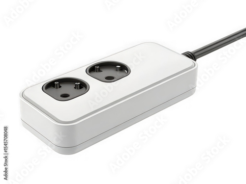 White two-socket power strip with black cord, isolated on black background, close-up view, modern design, electrical equipment.