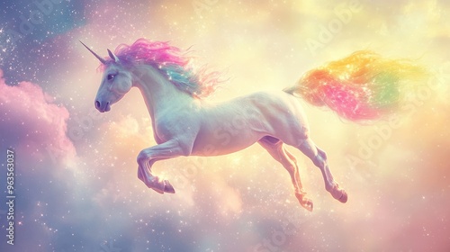 White unicorn with rainbow mane and tail flying through a dreamy sky.