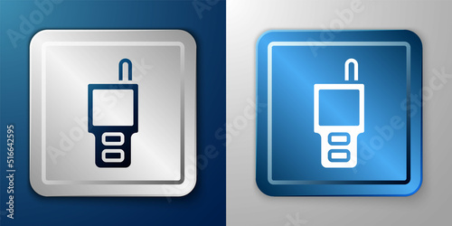 White Walkie talkie icon isolated on blue and grey background. Portable radio transmitter icon. Radio transceiver sign. Silver and blue square button. Vector