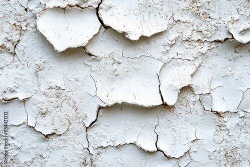 White wall with peeling paint, revealing layers of history and decay, creating a stark and textured backdrop.
