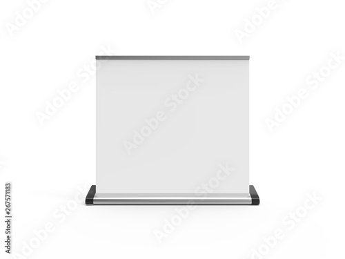 White wide blank roll-up banner mockup on isolated white background, showcase your design and layouts for exhibition or presentation, 3d illustration