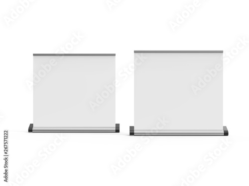 White wide blank roll-up banner mockup on isolated white background, showcase your design and layouts for exhibition or presentation, 3d illustration