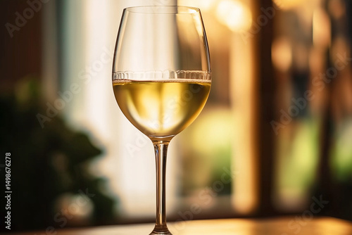 White Wine Glass on Wooden Table at Sunset