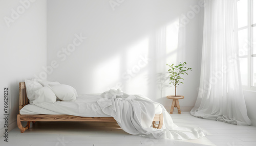 white wooden bed with white cloth in empty white room on background