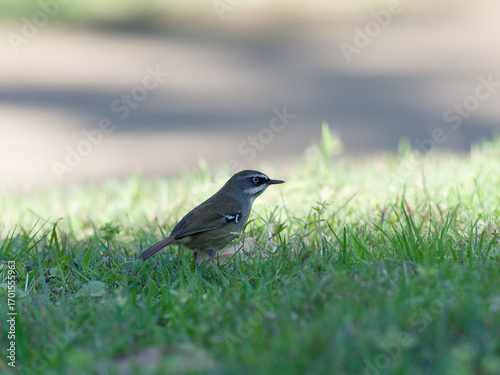 White-browed Scrubwren (Sericornis frontalis) on the ground foraging for insects and other bugs in grass.