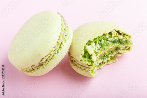 Whole and bitten green macarons or macaroons cakes on pastel pink background, side view, close up.