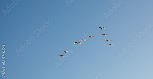 Whooper swans, or common swans, flying and migrating