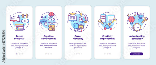 Why to learn to code onboarding mobile app screen. Education walkthrough 5 steps graphic instructions pages with linear concepts. UI, UX, GUI template. Myriad Pro-Bold, Regular fonts used