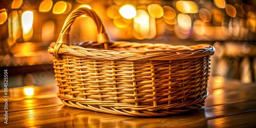 Wicker Basket on a Wooden Table with Warm Bokeh Lights, wicker basket, wooden table, bokeh, warm light