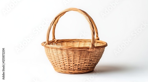 Wicker basket with one handle on a white background.
