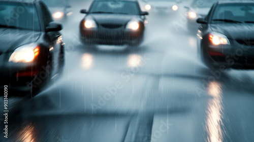 Wide angle shot of multiple cars hydroplaning on a highway, heavy rain, water spraying from tires, dark sky