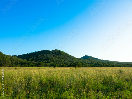 Wide angle shot of the spectacular savannah with Mountain range in the background at Kruger national park South Africa