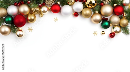 Wide arch shaped Christmas border isolated on white, composed of fresh fir branches and ornaments in red and silver