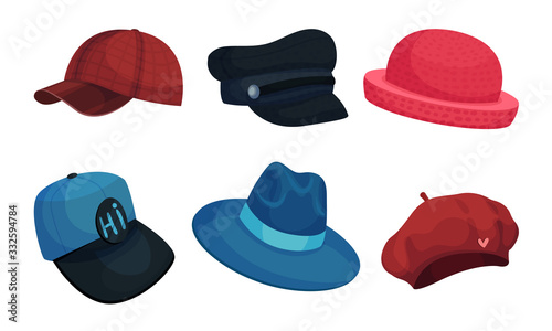 Wide Brimmed Hats and Headdresses Isolated on White Background Vector Set